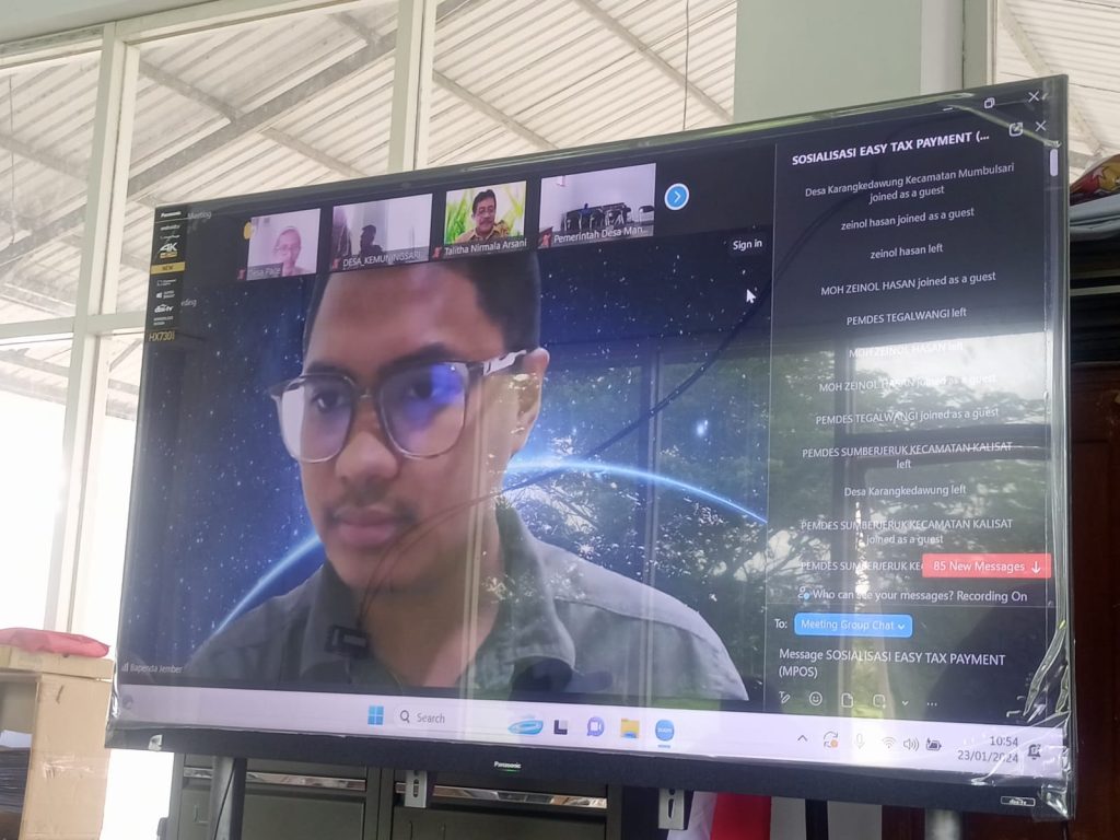 Suara Jember News, Jenggawah Jember – Pagi hari ini Selasa, 23 Januari 2024 Desa Kemuningsari Kidul mengikuti zoom Sosialisasi Easy Tax Payment (MPOS) yang di mulai pada pukul 9.30.