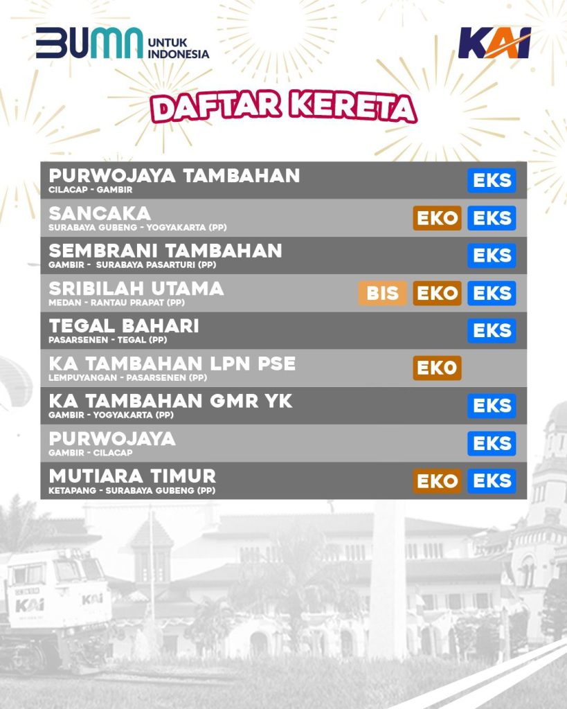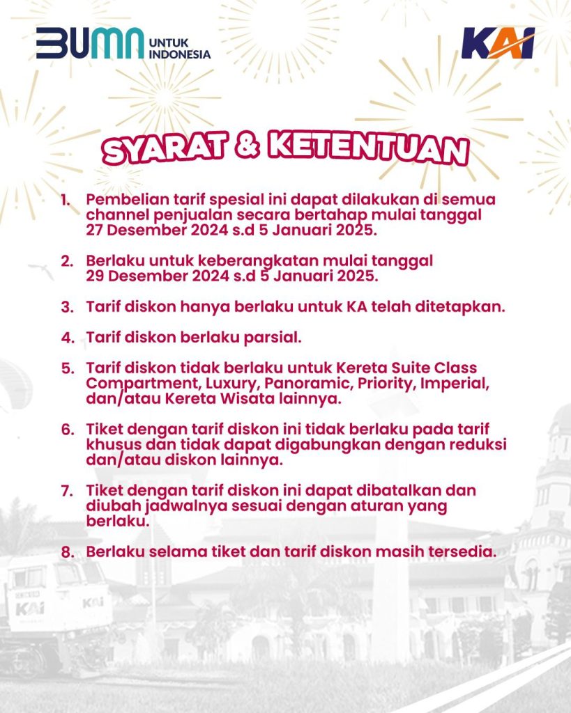 Menutup tahun 2024, KAI menghadirkan promo spesial “YES DEALS” yang menawarkan diskon hingga 30% untuk perjalanan tertentu selama masa liburan Natal dan Tahun Baru (Nataru). Promo ini berlaku untuk pembelian tiket mulai 27 Desember 2024 hingga 5 Januari 2025, dengan periode keberangkatan 29 Desember 2024 hingga 5 Januari 2025.