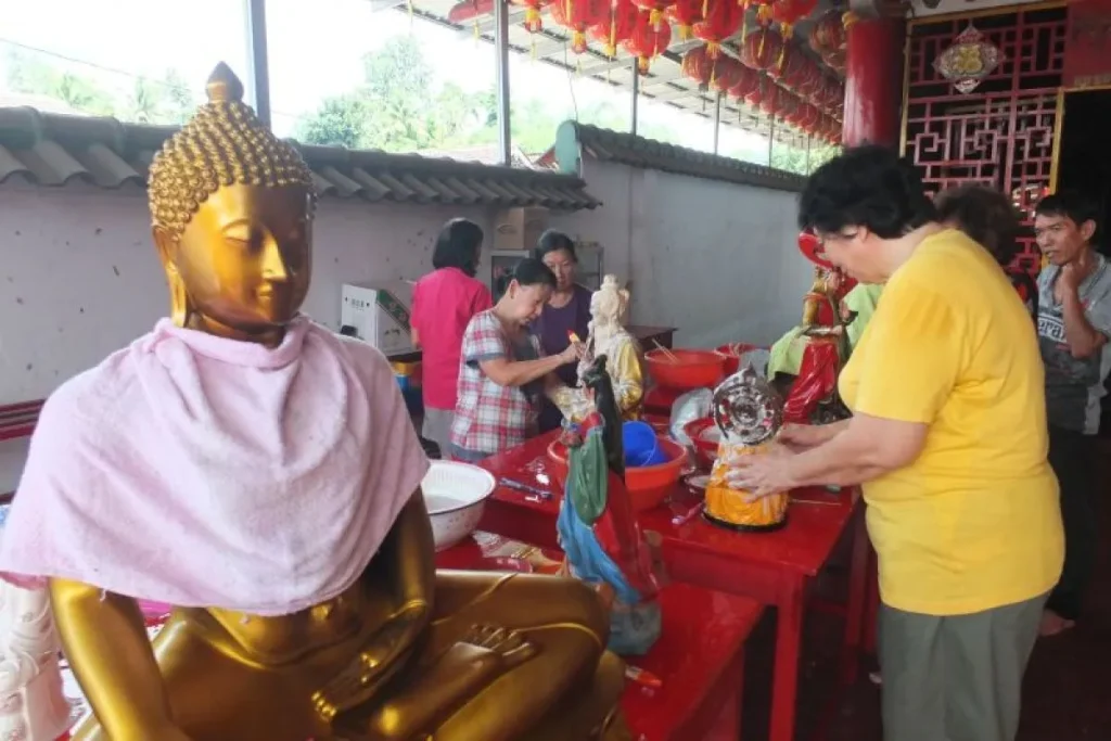 Seluruh patung diletakkan di atas meja, kemudian disucikan dengan menggunakan air yang dicampur dengan bunga mawar dan cendana, sehingga semerbak bau harum pada saat memandikan patung dewa-dewi kaum etnis Tionghoa.