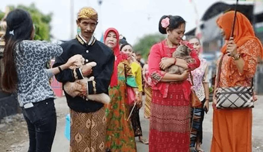 Kucing ini kemudian dibawa oleh sepasang warga yang berpakaian pengantin adat Jawa. Layaknya upacara pernikahan, dua kucing itu akan dipangku bersama di pelaminan.