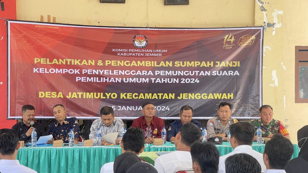 Suara Jember News, Jatimulyo, Jember – Desa Jatimulyo mengadakan upacara Pelantikan dan Pengambilan sumpah janji, Kelompok Penyelenggara Pemungutan Suara Pemilihan Umum Tahun 2024.