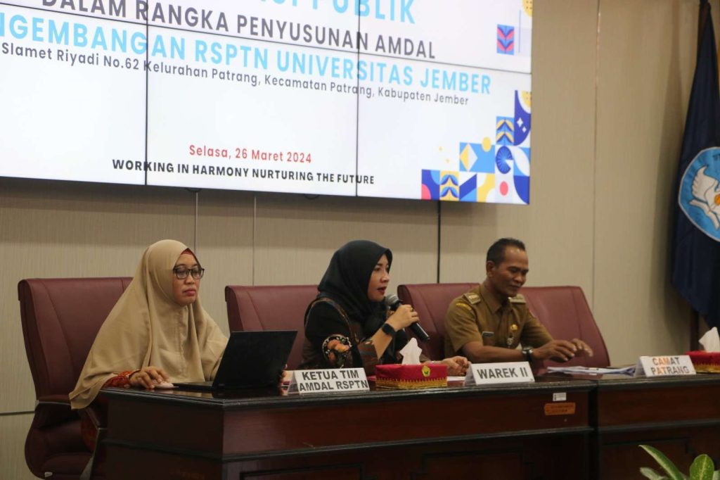 Ia pun berharap agar konsultasi publik yang telah diselenggarakan dapat dimanfaatkan dengan baik, sehingga masyarakat dapat terlibat langsung dalam pengambilan keputusan yang akan menentukan kelayakan kegiatan lingkungan kegiatan RSPTN UNEJ.